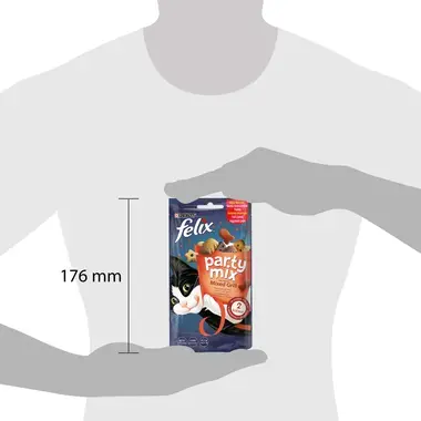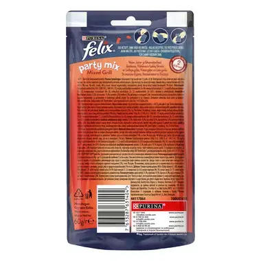 - FELIX® Party Mix Grill Mix veise, kana ja lõhega on ideaalne maiuspala - kolm lemmikmaitset ühes pakis.